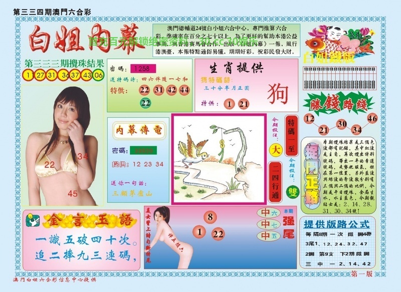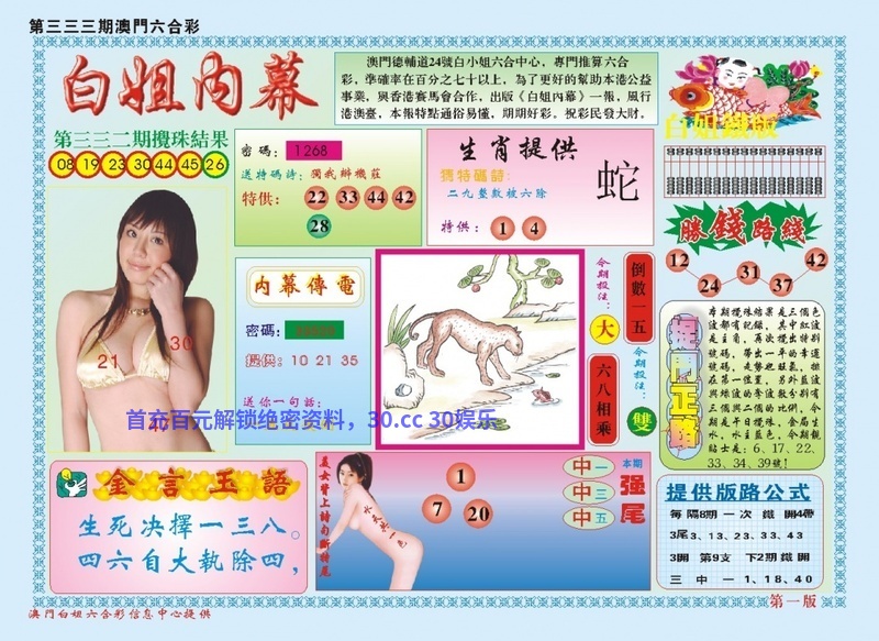 | 333期《白姐九肖》 综合九肖♘:鼠猪狗蛇羊鸡兔虎猴 综合七肖♘:鼠猪狗蛇羊鸡兔 综合五肖♘:鼠猪狗蛇羊 主攻特码♘:06.42.07.31.20.44.13.49.23.47 ![]() |